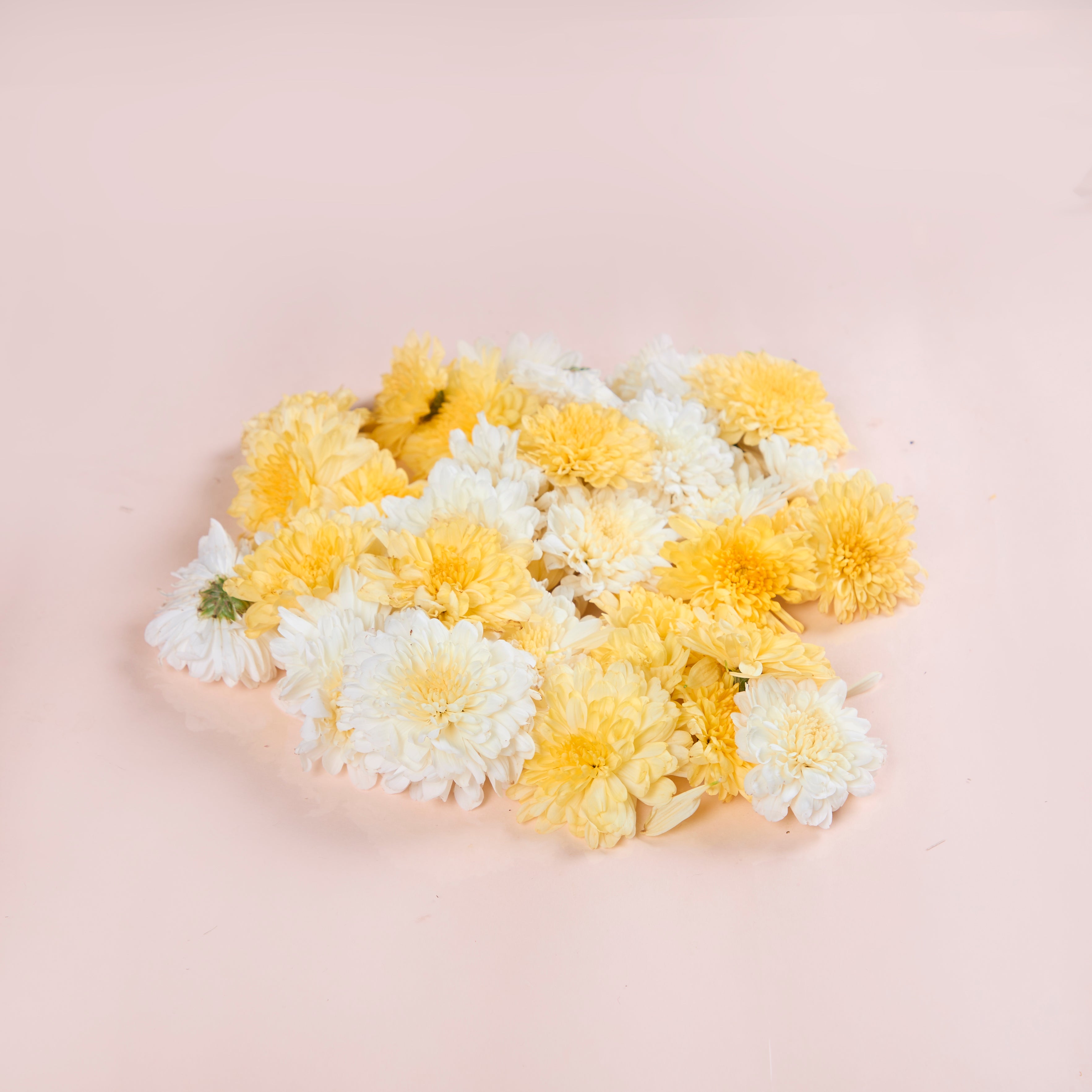 A colorful collection of white and yellow shevanti flowers for festive and devotional use. Ideal for temple offerings or brightening your home space. Each flower adds freshness and color to the atmosphere. Handpicked to ensure natural fragrance and purity. A cheerful blend that embodies joy and faith.